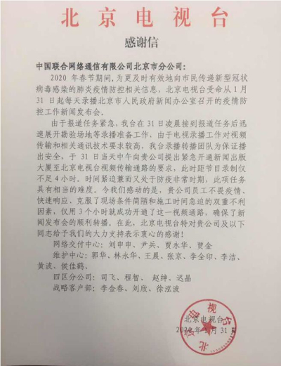 “令我們感動(dòng)的是:貴公司員工不畏疫情、快速響應(yīng),克服了現(xiàn)場(chǎng)條件簡(jiǎn)陋和施工時(shí)間緊迫的雙重不利因素,僅用3個(gè)小時(shí)就成功開(kāi)通了這一視頻通路,確保了新聞發(fā)布會(huì)的順利轉(zhuǎn)播。在此,北京電視臺(tái)特對(duì)貴公司及以下同志給予我們的大力支持表示衷心感謝!”----2月1日,北京聯(lián)通收到北京電視臺(tái)一封深情的感謝信,贊揚(yáng)北京聯(lián)通員工不畏疫情,克服困難,快速響應(yīng),順利保障轉(zhuǎn)播。