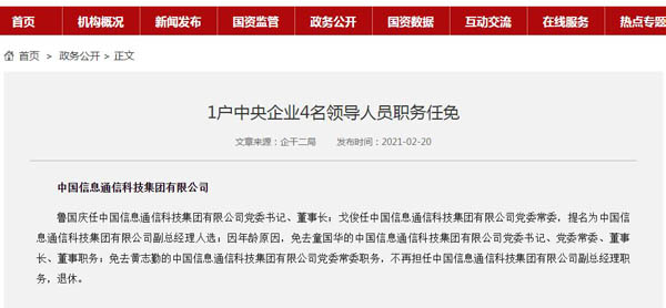 具體為:魯國(guó)慶任中國(guó)信息通信科技集團(tuán)有限公司黨委書記、董事長(zhǎng);戈俊任中國(guó)信息通信科技集團(tuán)有限公司黨委常委,提名為中國(guó)信息通信科技集團(tuán)有限公司副總經(jīng)理人選;因年齡原因,免去童國(guó)華的中國(guó)信息通信科技集團(tuán)有限公司黨委書記、黨委常委、董事長(zhǎng)、董事職務(wù);免去黃志勤的中國(guó)信息通信科技集團(tuán)有限公司黨委常委職務(wù),不再擔(dān)任中國(guó)信息通信科技集團(tuán)有限公司副總經(jīng)理職務(wù),退休。