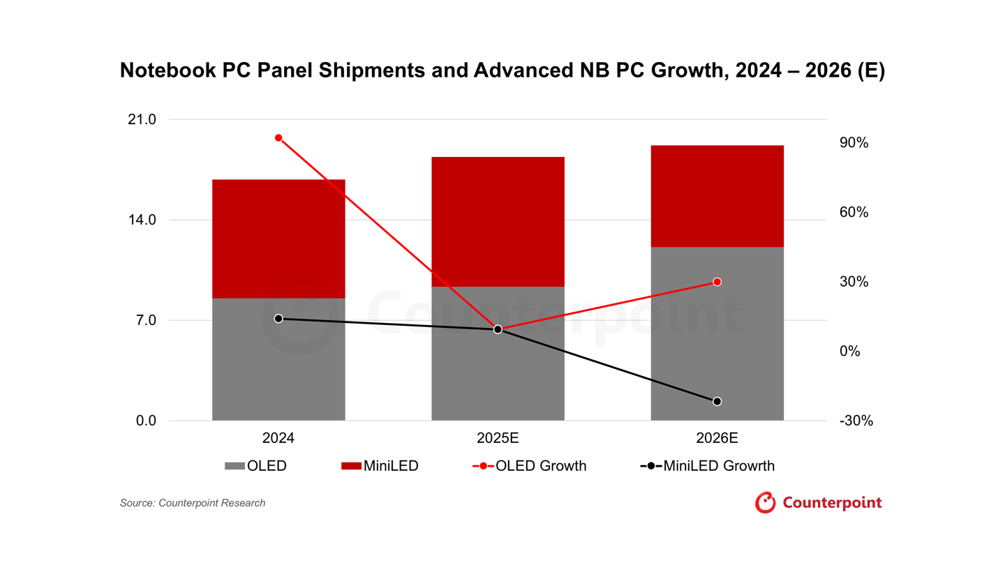 展望 2026 年,隨著成本效率的提升以及更多品牌拓展高端產品線,OLED 筆記本電腦的市場份額預計將持續(xù)增長。
