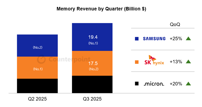 10 月 14 日消息,分析機(jī)構(gòu) Counterpoint 韓國當(dāng)?shù)貢r(shí)間今日預(yù)計(jì),三星電子有望以 194 億美元(IT之家注:現(xiàn)匯率約合 1384.18 億元人民幣)的 2025 年三季度營收超越 SK 海力士的 175 億美元(現(xiàn)匯率約合 1248.62 億元人民幣)重奪全球最大存儲(chǔ)廠商地位。