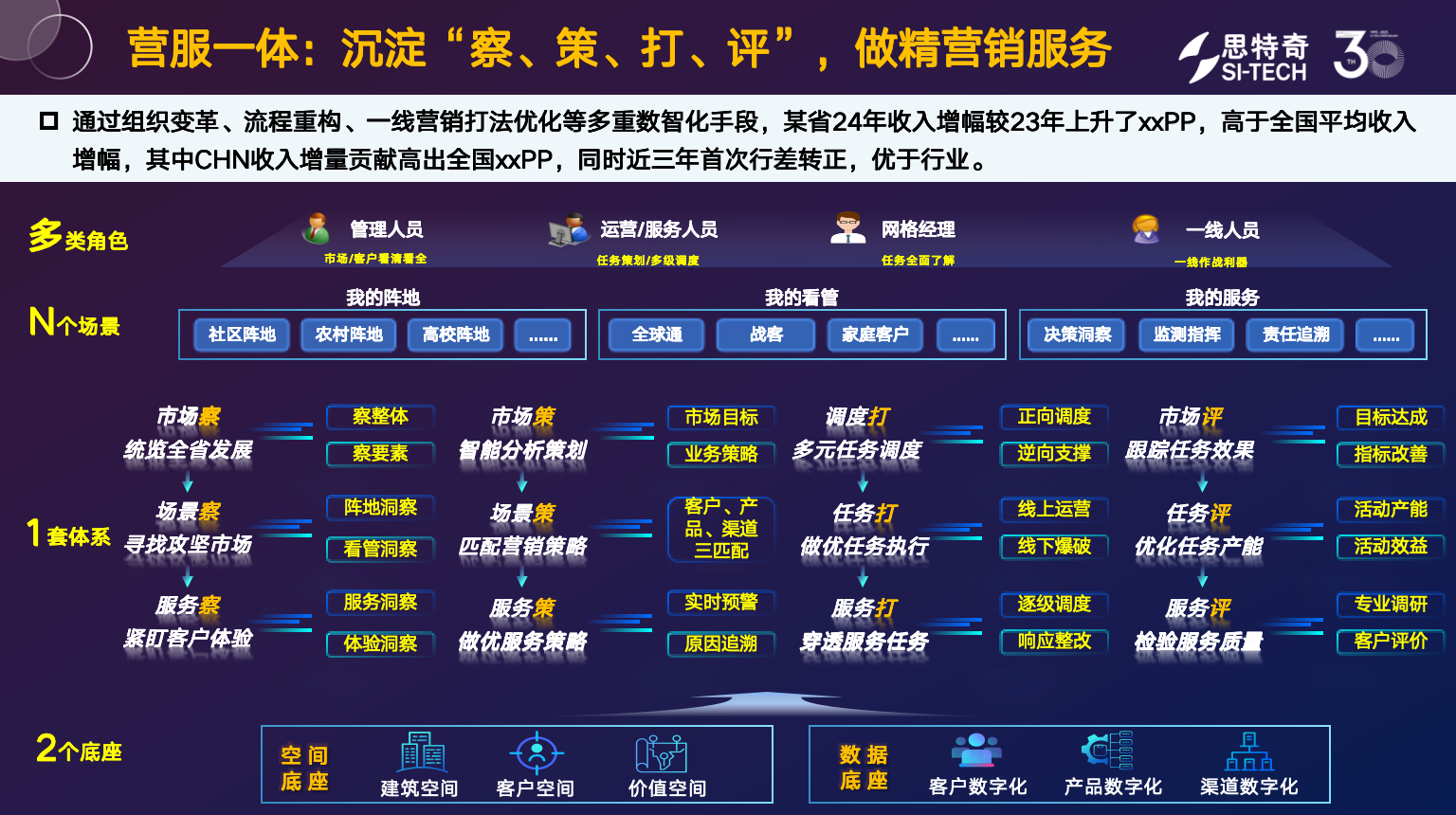 針對運營商大市場運營的核心痛點,思特奇"市場全息作戰(zhàn)"方案以"存增一體、營服一體"為戰(zhàn)略目標,構(gòu)建全鏈路指揮作戰(zhàn)體系,沉淀"察、策、打、評"四大核心能力,徹底激活市場數(shù)智化轉(zhuǎn)型動能。該體系通過組織架構(gòu)革新打破部門壁壘、流程重構(gòu)優(yōu)化業(yè)務(wù)鏈路、一線打法升級提升執(zhí)行效能,形成"數(shù)據(jù)驅(qū)動決策、智能賦能執(zhí)行"的閉環(huán)運營模式。