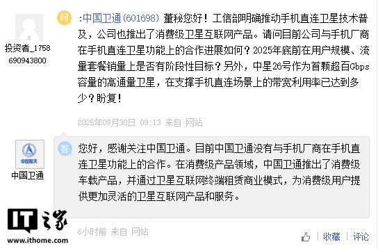 中國衛(wèi)通:目前沒有與手機(jī)廠商在手機(jī)直連衛(wèi)星功能上的合作
