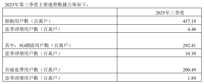 數據顯示,2025年第三季度,中國電信移動用戶總數達到4.3719億戶,第三季度凈增用戶數448萬戶;5G網絡用戶數達2.9241億戶,本季度凈增1039萬戶;有線寬帶累計用戶數達2.0049億戶,本季度凈增189萬戶。