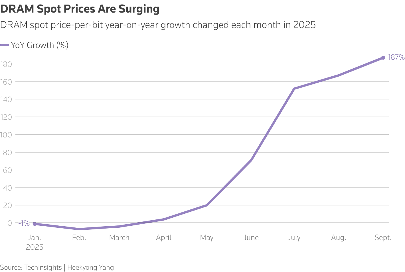 同樣,根據(jù)TechInsights提供的數(shù)據(jù),用于各種應(yīng)用的DRAM現(xiàn)貨價(jià)格在4月份僅上漲4%之后,9月份同比增長近兩倍。
