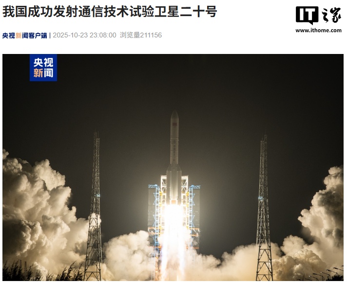 10 月 23 日消息,據(jù)央視新聞報(bào)道,北京時(shí)間 2025 年 10 月 23 日 22 時(shí) 30 分,我國在文昌航天發(fā)射場使用長征五號(hào)運(yùn)載火箭,成功將通信技術(shù)試驗(yàn)衛(wèi)星二十號(hào)發(fā)射升空,衛(wèi)星順利進(jìn)入預(yù)定軌道,發(fā)射任務(wù)獲得圓滿成功。該衛(wèi)星主要用于開展多頻段、高速率衛(wèi)星通信技術(shù)驗(yàn)證。