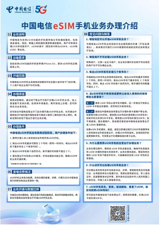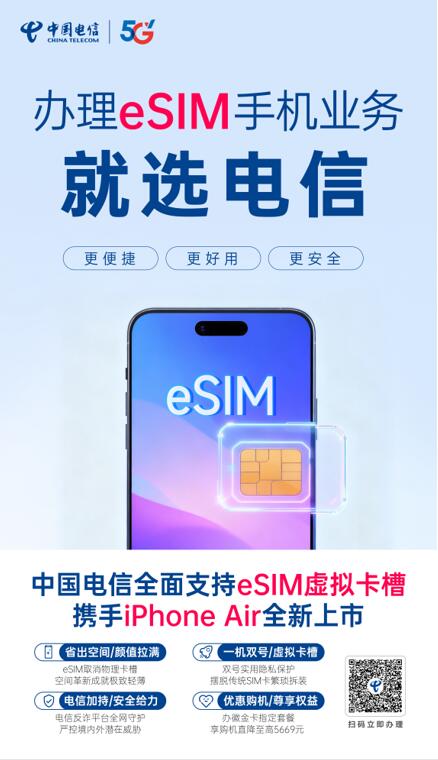 在商用試驗(yàn)期間,安徽電信暫不提供線上辦理渠道。新老用戶只需攜帶支持eSIM功能的手機(jī)及本人身份證,前往安徽電信任自有營業(yè)廳,即可申請辦理eSIM手機(jī)業(yè)務(wù)。目前,蘋果iPhone 17 Air成為首款支持eSIM手機(jī)業(yè)務(wù)的機(jī)型。安徽電信已于2025年10月22日起正式首銷,用戶現(xiàn)場開通即可體驗(yàn)辦理。營業(yè)廳工作人員將提供全程指導(dǎo),幫助用戶完成eSIM功能開通。同時(shí),中國電信APP已同步開放線上預(yù)約。