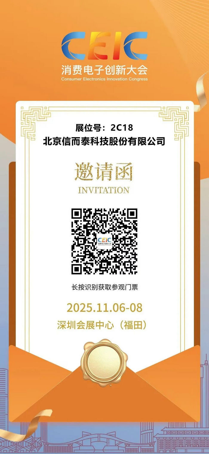 北京信而泰科技股份有限公司誠摯邀請您蒞臨 2025消費電子創(chuàng)新大會(CEIC 2025) ,與我們共同探索消費電子領(lǐng)域的前沿技術(shù)與創(chuàng)新應(yīng)用。本次大會將于 2025年11月6日至8日 在 深圳會展中心(福田)2號館 隆重舉行,我司展位號為 2C18,期待與您相見!