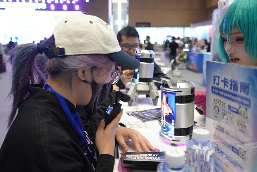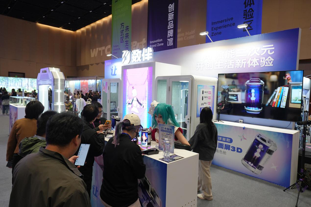 數(shù)伴展位以“AI·次元交互體驗(yàn)”為主題,打造了兼具科技感與趣味性的沉浸互動(dòng)空間。兩位人氣Coser分別飾演看板娘“姵兒”和“初音未來(lái)”,在現(xiàn)場(chǎng)與觀眾親密互動(dòng),吸引大家參與體驗(yàn)環(huán)節(jié)與抽獎(jiǎng)活動(dòng)。現(xiàn)場(chǎng)氛圍熱烈,觀眾拍照打卡上傳至社交媒體,相關(guān)話題熱度持續(xù)攀升,成為WTCC期間備受年輕人關(guān)注的展位之一。
