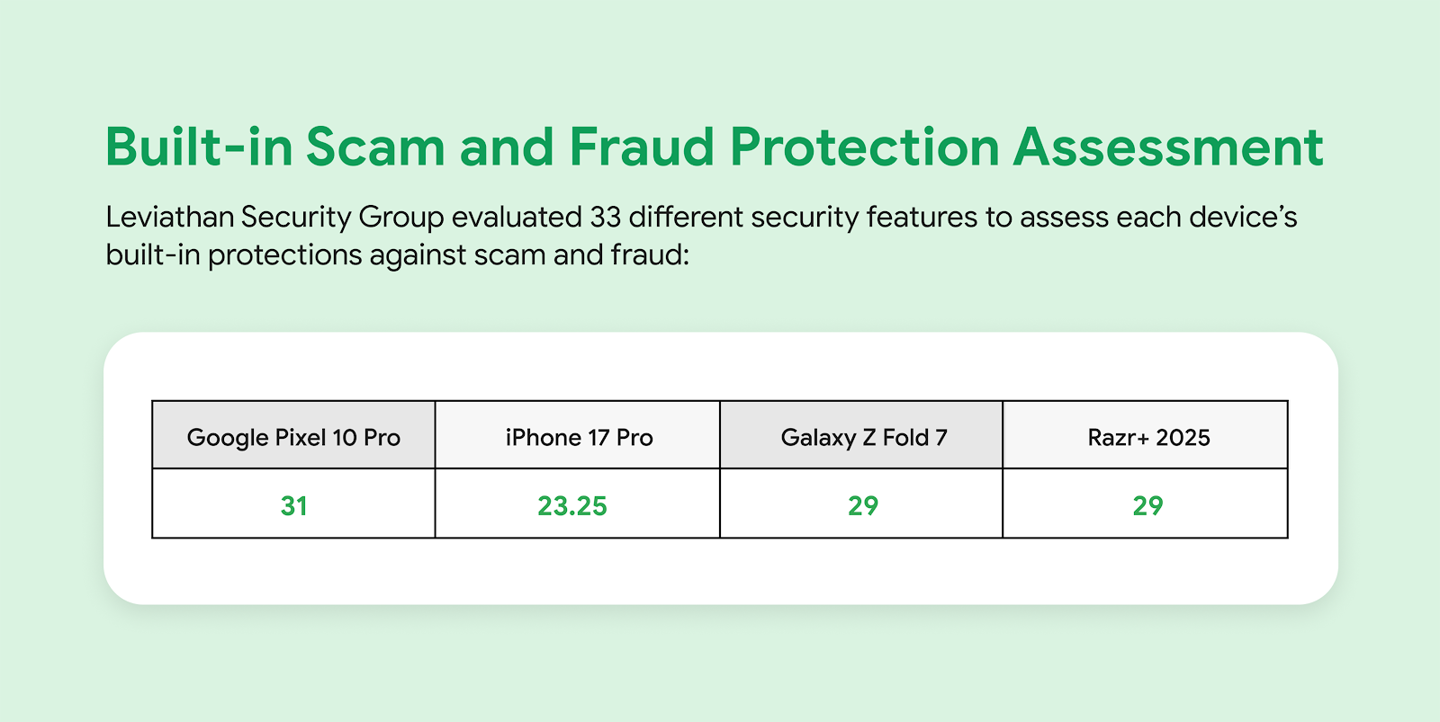 另一家安全公司 Leviathan Security Group 的評估結(jié)果更為直接,將 Pixel 10 Pro 列為默認詐騙防護能力最強的設(shè)備,領(lǐng)先于其他安卓旗艦機型和 iPhone 17 Pro。