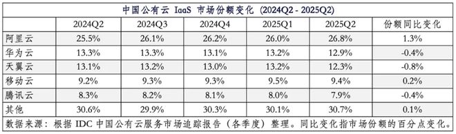 10月31日,IDC發(fā)布最新的《中國(guó)公有云服務(wù)市場(chǎng)(2025上半年)跟蹤》報(bào)告。報(bào)告顯示,2025年第二季度,阿里云在中國(guó)公有云基礎(chǔ)設(shè)施即服務(wù)(IaaS)市場(chǎng)的份額攀升至26.8%,連續(xù)五個(gè)季度份額上漲。