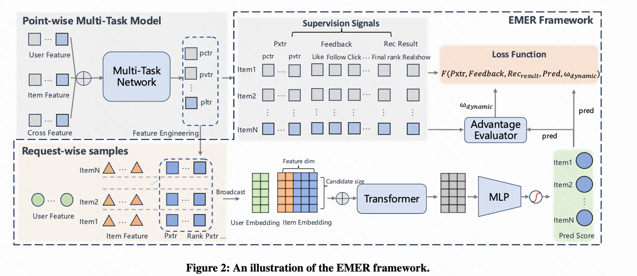 傳統(tǒng)方法本質上是讓模型為每個視頻“單獨打分”,但排序的真諦在于“比較”。快手推出的EMER框架的核心突破在于,它讓AI模型學會了在同一批候選視頻中進行比較和選擇,更貼近真實的推薦場景。同時,EMER構建了一套基于“相對優(yōu)勢滿意度 + 多維滿意度代理指標”的方法體系,形成有效的監(jiān)督目標,從而精準量化并持續(xù)優(yōu)化用戶滿意度。