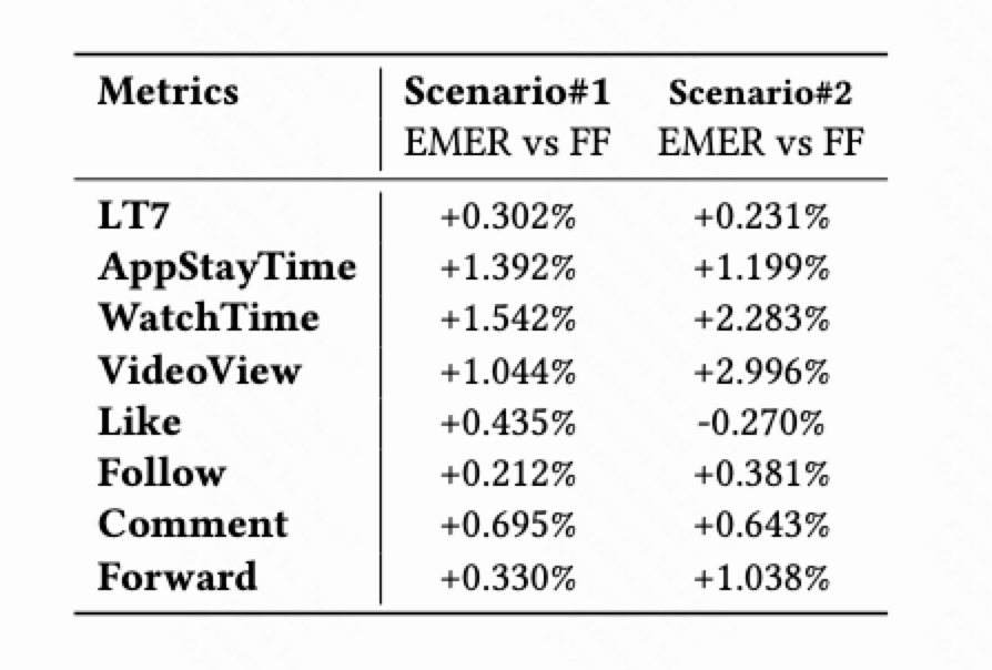 EMER 框架并非理論方案,而是經實戰(zhàn)驗證的 “增效利器”。從實驗數(shù)據來看,效果超出預期,對比傳統(tǒng)人工公式,快手極速版七日留存提升0.196%、停留時長提升1.392%;快手App七日留存提升0.133%、停留時長提升1.199%,單列短視頻觀看次數(shù)提升2.996%,實現(xiàn)多目標均衡增長。