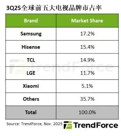 全球前五大電視品牌依序為 Samsung(三星)、Hisense(海信)、TCL、LGE 與 Xiaomi(小米),合計市占率達(dá) 64.3%。其中海信下半年起由守轉(zhuǎn)攻,內(nèi)外銷皆以低價搶市,成功推升第三季出貨量達(dá) 766 萬臺、環(huán)比增長 9.7%,重回全球第二,市占率也提升至 15.4%,創(chuàng)歷年同期新高。