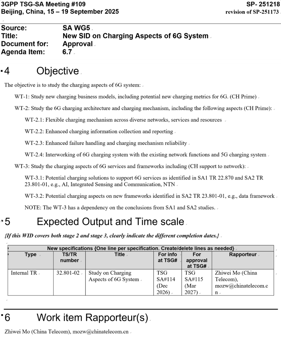 中國電信表示,作為 3GPP 首個(gè) 6G 計(jì)費(fèi)項(xiàng)目,該立項(xiàng)將面向 6G 新型服務(wù)設(shè)計(jì)新的計(jì)費(fèi)模式,包括探索 6G 新型計(jì)費(fèi)商業(yè)模式與計(jì)費(fèi)量綱,研究跨網(wǎng)絡(luò)、跨服務(wù)和跨資源的 6G 計(jì)費(fèi)架構(gòu)與機(jī)制,并為 AI、通感、天地一體等 6G 關(guān)鍵服務(wù)提供可行的計(jì)費(fèi)方案。